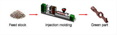 ◆ Feedstock preparation - The first step is to create a powder mixture of metal and polymer. The powder metals used here are much finer (typically under 20 microns) than those used in traditional powder metallurgy processes. The powder metal is mixed with a hot thermoplastic binder, cooled, and then granulated into a homogenous feedstock in the form of pellets. The resulting feedstock is typically 60% metal and 40% polymer by volume.